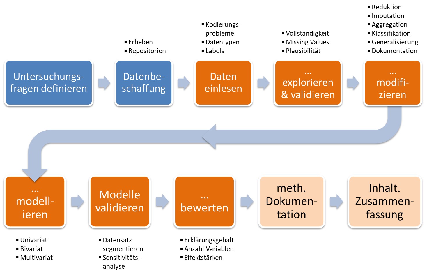 Unabhängig von der gewählten Fragestellung bestehen Datenanalysen aus einer Abfolge unterschiedlicher Arbeitsschritte: