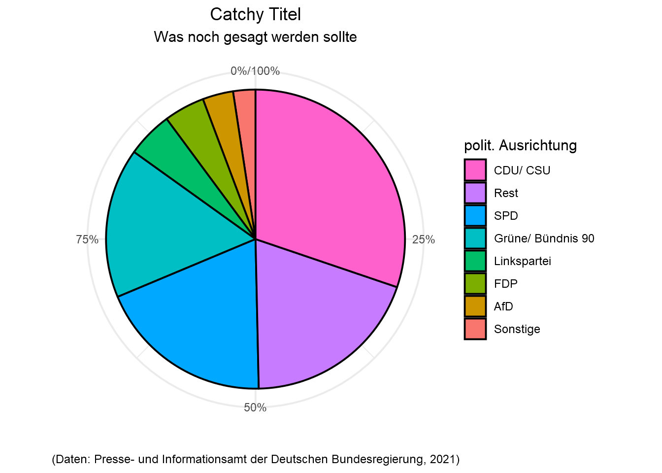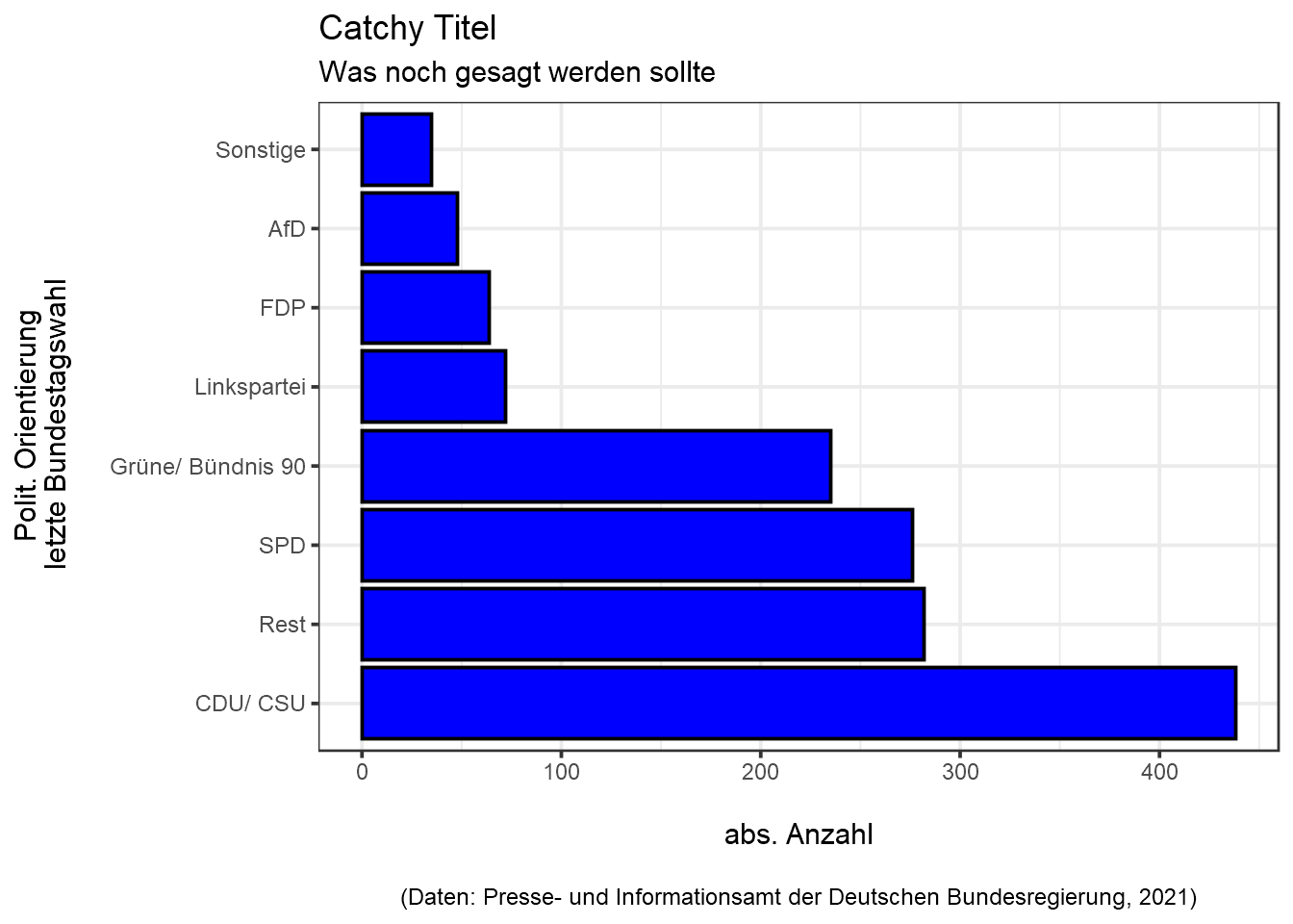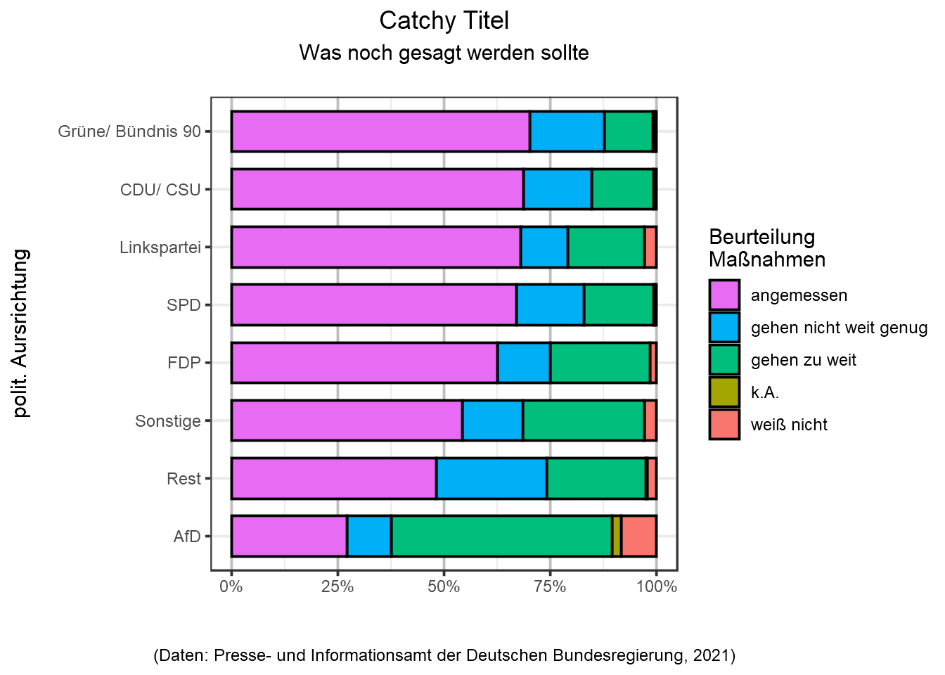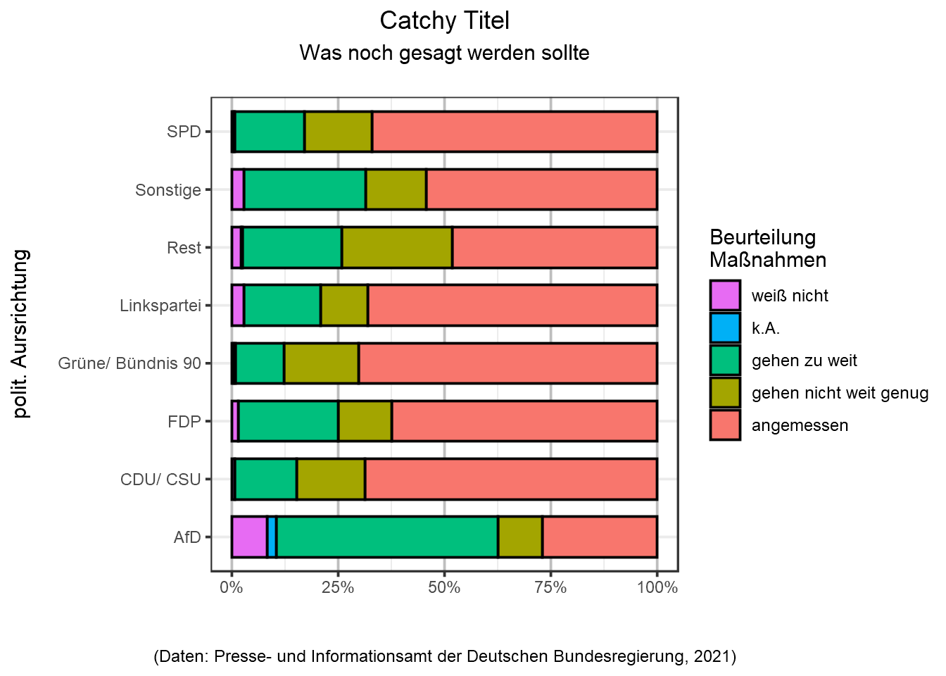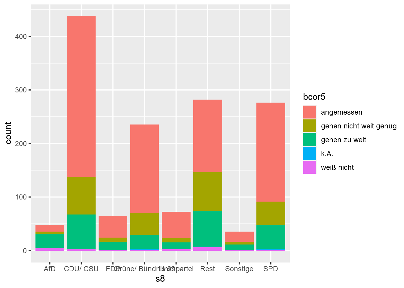 Die Sortierung der Kategorienachse “polit. Ausrichtung” könnte noch optimiert werden, um LerserInnen beispielsweise die politischen Ausrichtungen (Variable bcor5) anhand der Angemessenheit der Maßnahmen (Ausprägung “angemessen”) absteigend darzustellen: