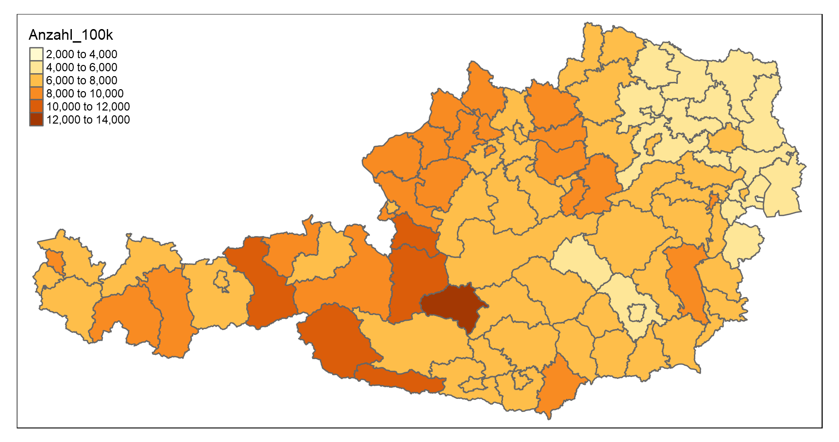 2. Um eine Vergleichbarkeit der COVID-19 Erkrankungen zwischen den Bezirken herbeizuführen, normieren wir die Angaben zu den Erkrankungen (in den letzten sieben Tagen) und Verstorbenen auf 100.000 Einwohner.