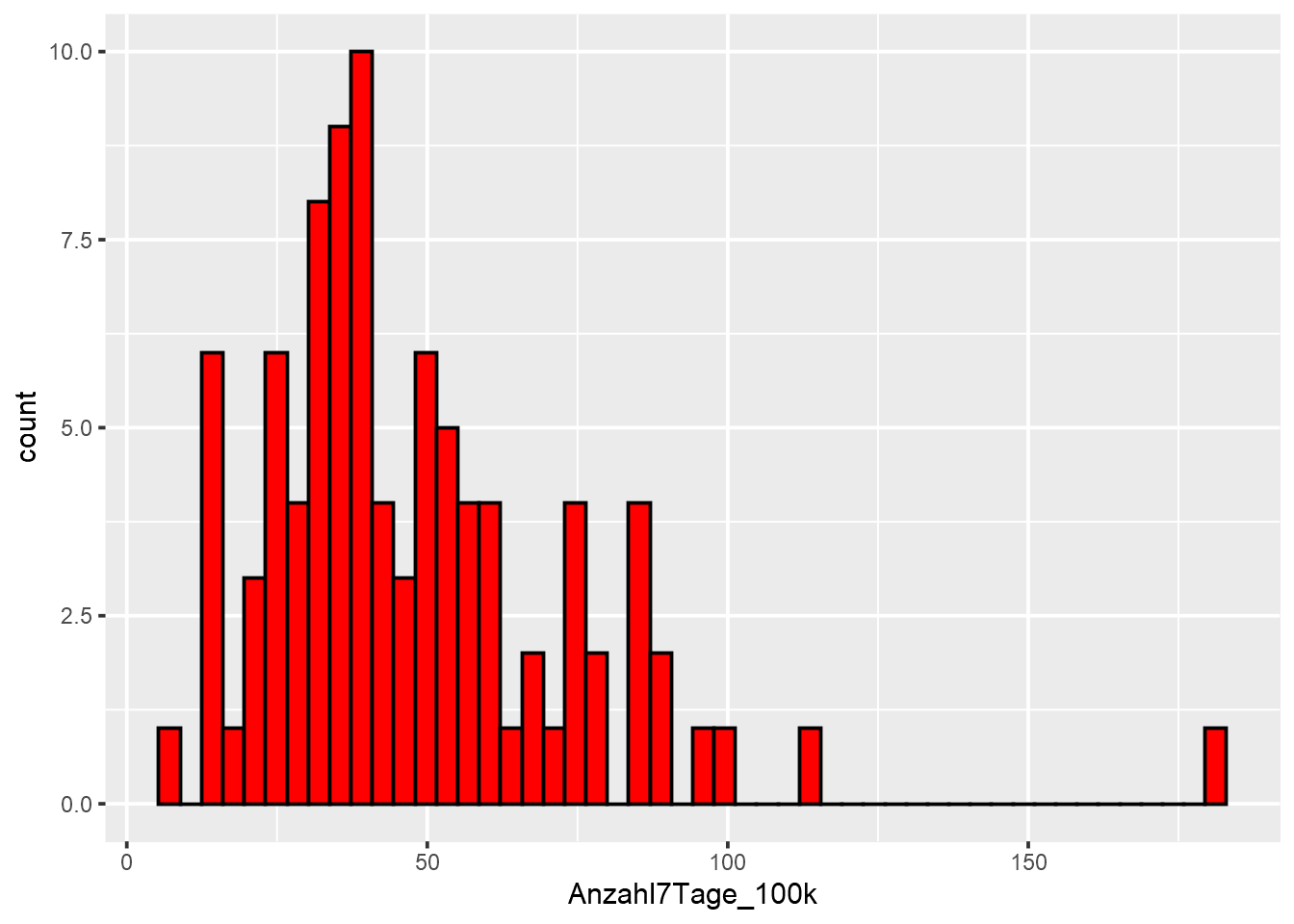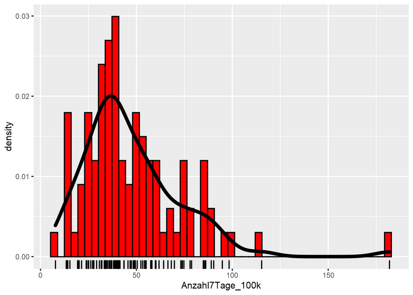 In unserem Fall spricht der rechte “tail” der beobachteten Dichtefunktion eher gegen eine Normalverteilung der CORONA-19 Erkrankungen je 100.000 Einwohner in den letzten sieben Tagen.