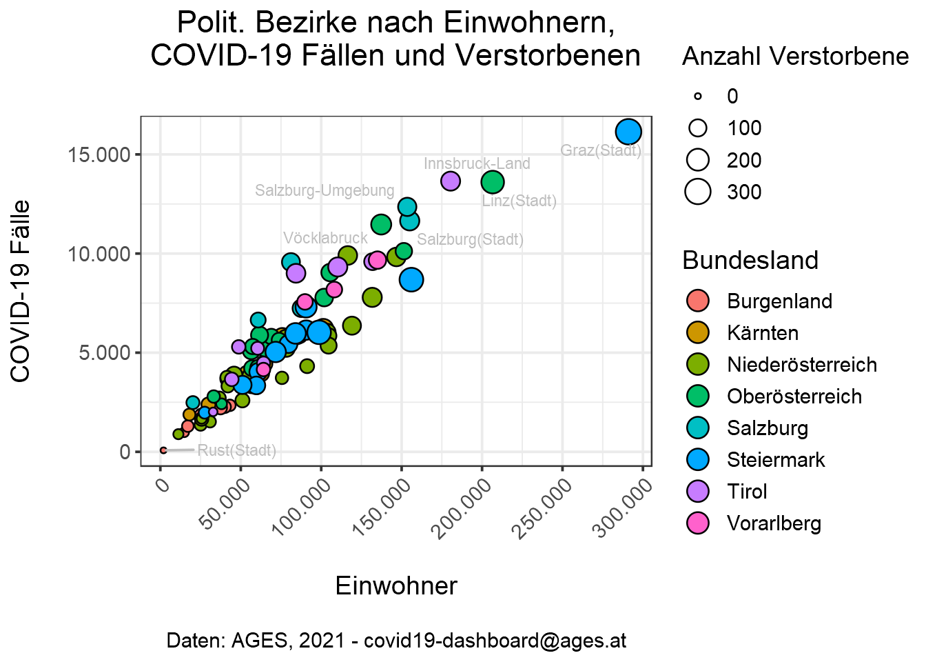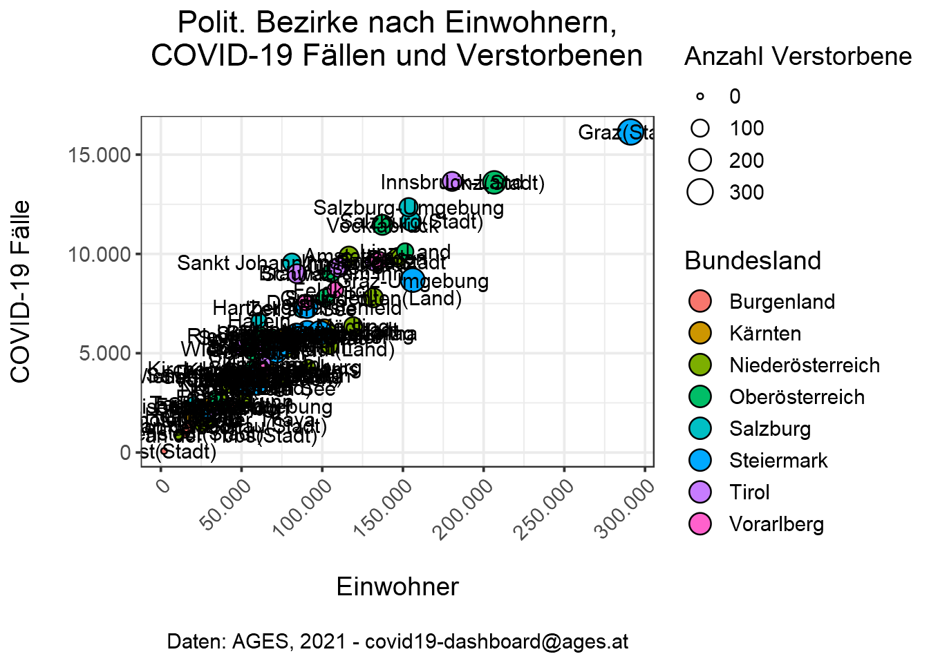Für explorative Zugänge ist es oftmals inhaltlich zielführend, mehrere Variablen graphisch zueinander in Beziehung zu setzen. Beispielsweise könnten wir uns fragen, ob wir zwischen der Einwohnerzahl der Bezirke, deren Bundeslandzugehörigkeit, und den COVID-19 Erkrankungen sowie Verstorbenen einen Zusammenhang gibt. Dabei filtern wir den politischen Bezirk Wien aus, um die Verteilung der restlichen Bezirke besser studieren zu können: