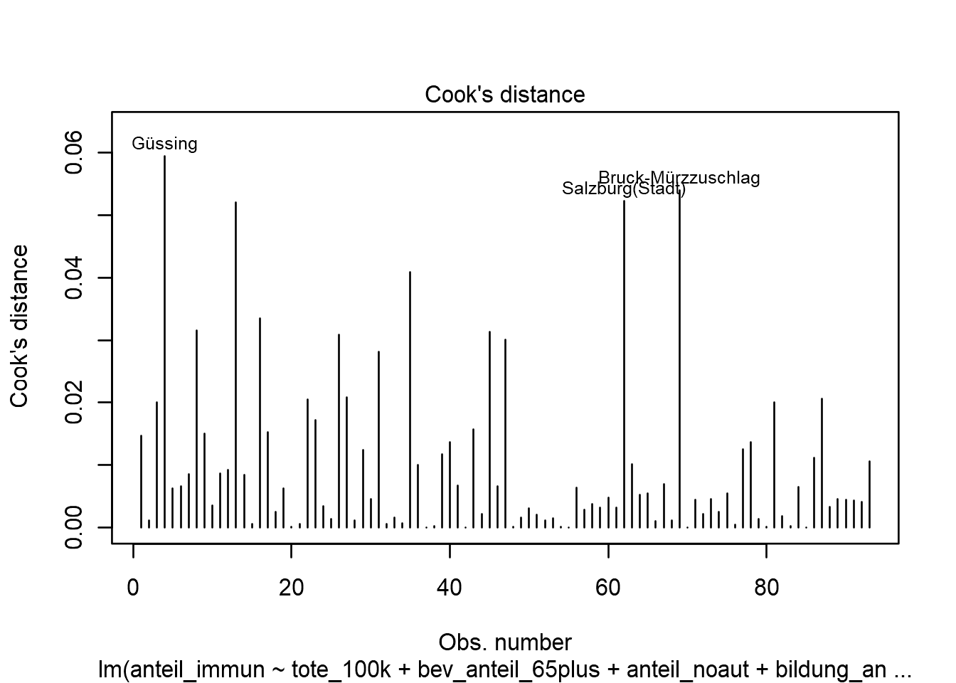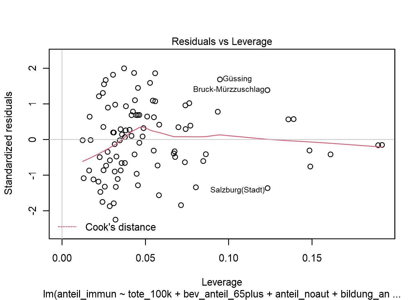 In unserem Fall liegt diese Schwelle also bei 2*(4 + 1)/93 = 0,11 welche nur durch wenige Ausreißer übertroffen wird. In der Zusammenschau aus standardisierten Residuen und der Leverage können jedoch starke Verzerrungen des Regressionsmodells ausgeschlossen werden.
