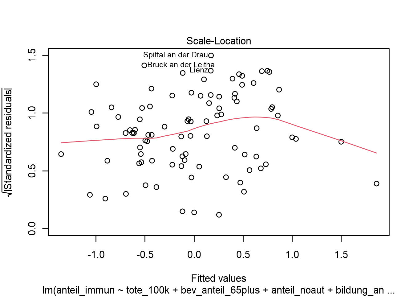 Im Idealfall zeigt die Verteilung der Varianzen (Wurzel der “Standardized residuals”) über die prognostizierten Werte (“Fitted values”) eine annähernd horizontale Verteilungslinie mit gleichverteilten Punkten.