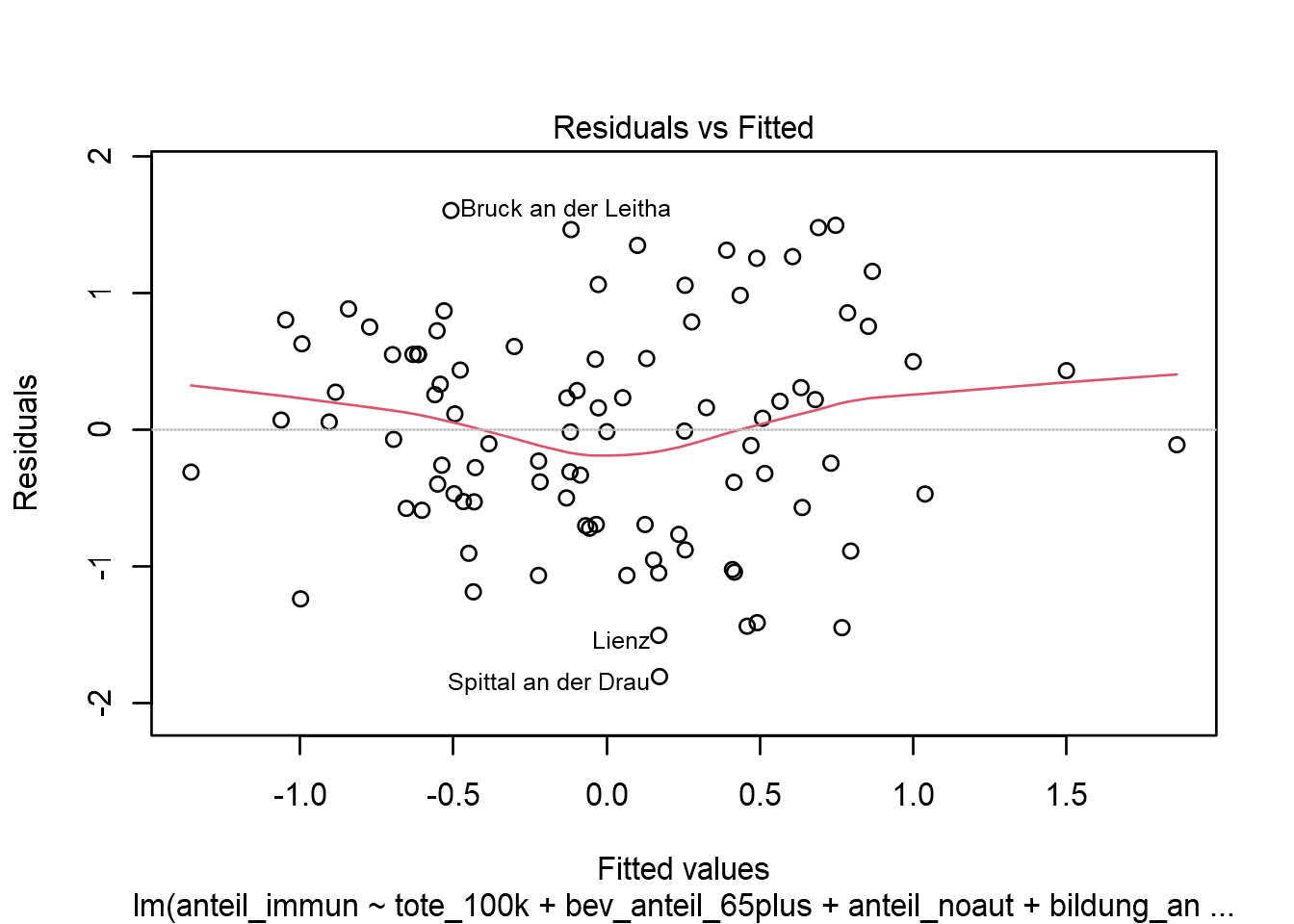 Ein weitere oftmals genutzte Möglichkeit bietet der sgn. “Residuals vs. Fitted”-Plot: