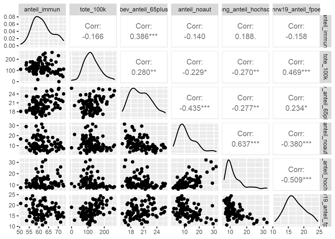 Der ersten Spalte dieser Matrix entnehmen wird, dass keine der erklärenden Variablen einen klar erkennbaren exponentiellen oder einen sonstigen nicht-linearen Zusammenhang zur Impfquote aufweist.