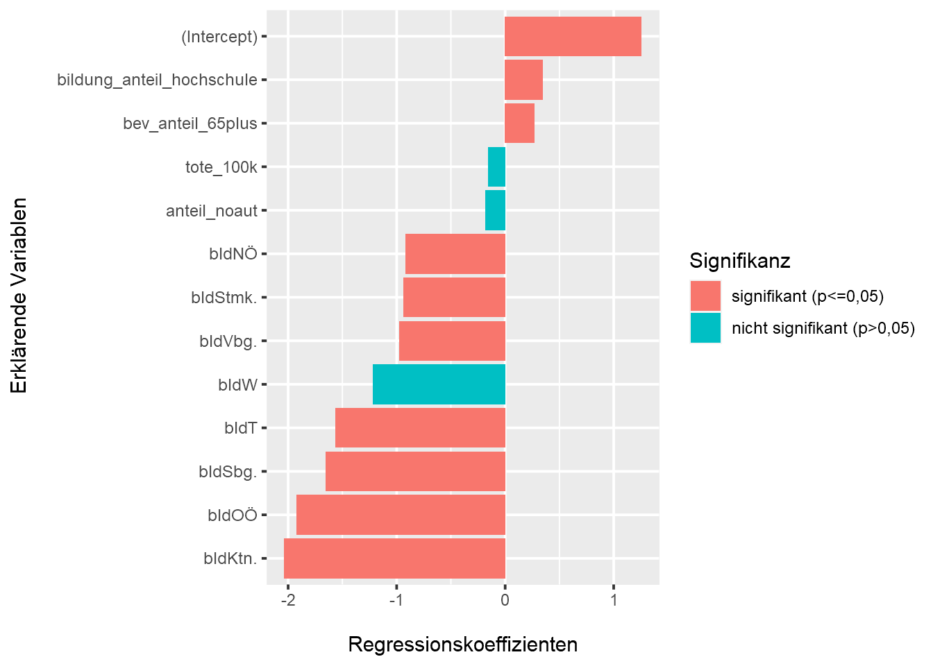 Jep, da wir ja nur n-1 Dummy-Codes nutzen um die Bundeslandzugehörigkeiten der Bezirke abzubilden. Im Fall von Eisenstadt (Stadt) heißt das, dass sich R dazu entschieden hat, das erste Level des Faktors “bld” (= “Bgld.”) als Linearkombination der restlichen acht Levels dieses Faktors zu interpretieren. Die Logik dahinter: Wenn ein Bezirk nicht zu den acht Bundesländer Kärnten bis Wien gehört, muss er zwangsweise ein burgenländischer Bezirk sein.