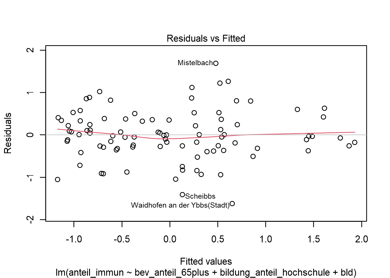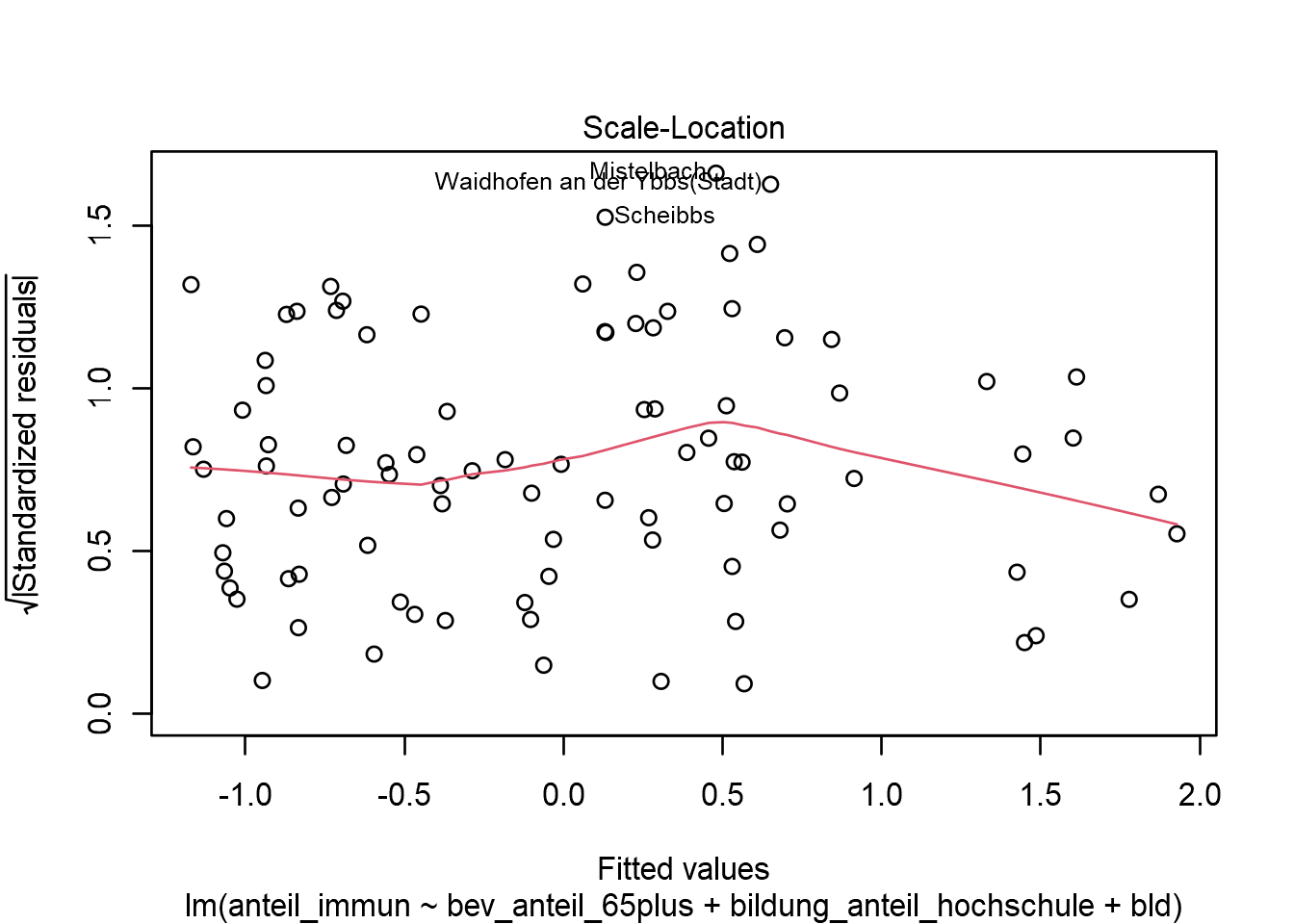 Die Adleraugen haben sicherlich den Fehler im obigen Output erkannt: Warning: not plotting observations with leverage one: 93. Diese Fehlermeldung lässt sich in unserem Fall auf die Datenstruktur zurückführen: Kategoriale Variablen bei denen ein Level nur mit einer Beobachtung besetzt sind, verursachen Probleme bei der Berechnung von Residuen. In unserem Fall trifft das auf den Bezirk Wien (Rekord Nr. 93), da er der einzige Bezirk im Bundesland Wien ist.