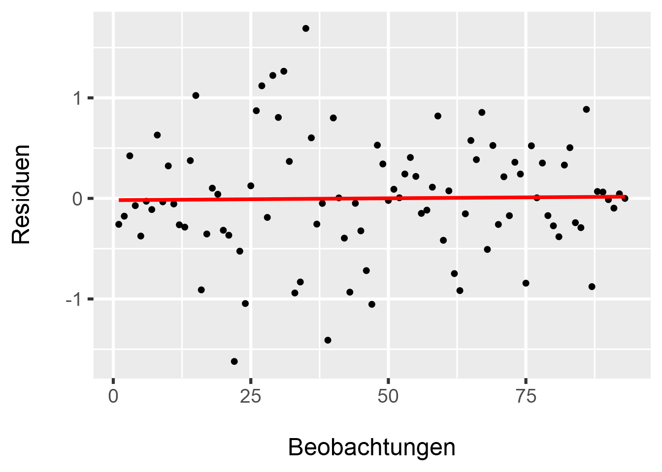 Und wieder ist ein “Jep!” angebracht: Wir sehen in der Verteilung der Residuen über die Beobachtungen keine auffälligen Muster, was auch durch die Lagen der Regressionsgeraden entlang der Nullline bestätigt wird. Wir können also eine Autokorrelation ausschließen.
