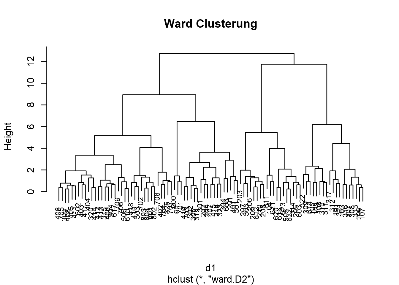 Die von den roten Kästen umschlossenen Bezirke gehören einem Cluster an. Standardmäßig nummeriert R diese Cluster von 1 ganzzahlig aufsteigend durch. Wir erhalten somit folgenden Clusterbesatz: