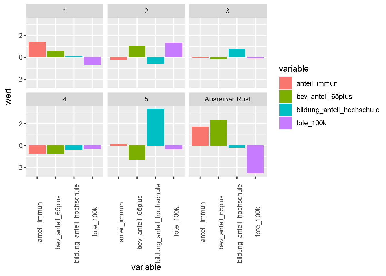 Vermutlich nicht, da diese Operationalisierung primär durch den Wunsch geprägt ist, den aus den Kapitel 5 und 6 bekannten Datensatz erneut zu nutzen. Dementsprechend finden Indikatoren wie beispielsweise regionale Inzidenzen etc. keinen Eingang. Da wir in dieser Einheit den Fokus auf ein methodischen Kennenlernen clusteranalytischer Verfahren legen, wurde auf eine komplexere und validere Operationalisierung verzichtet.