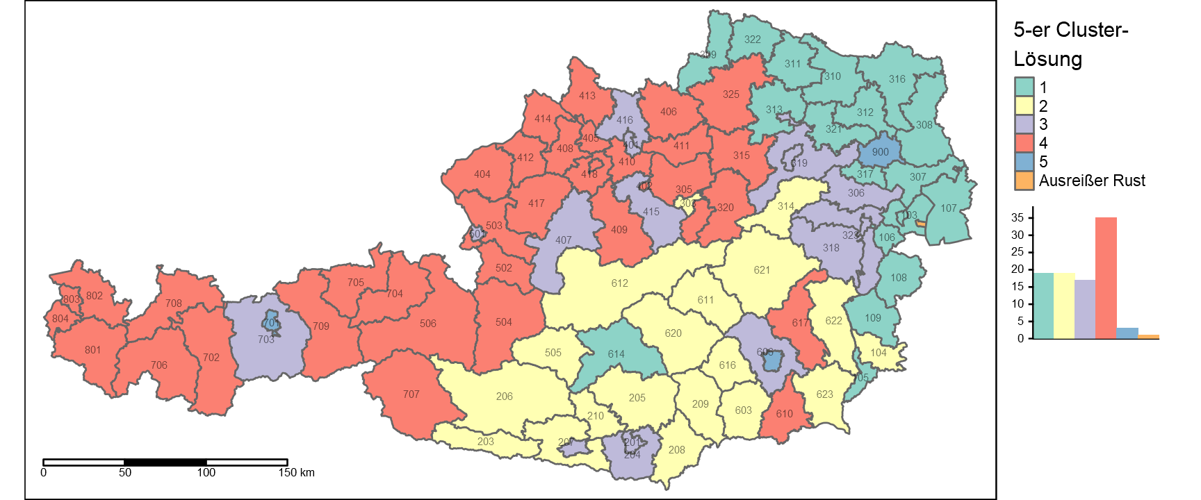 Der Vollständigkeit halber müssen wir noch den Bezirk 102 (Rust im Burgenland) noch manuell unserem Ausreißercluster zuordnen: