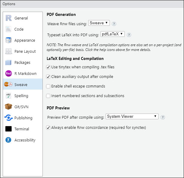 Nun können in einem letzten Schritt über das Menü “Tools > Global Options…” in der Sektion “Sweave” folgende Einstellungen vorgenommen werden: