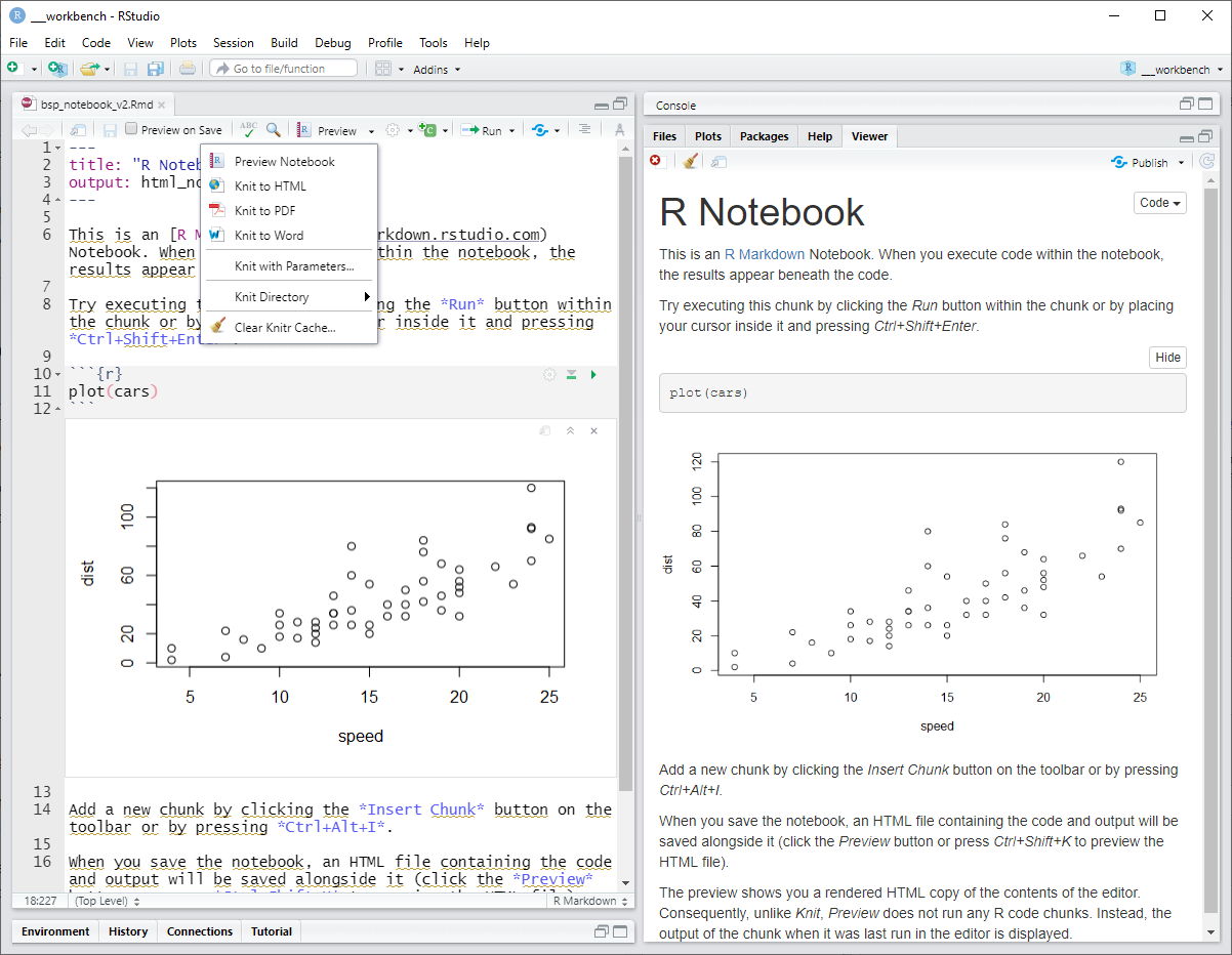 Da Notebooks eine spezielle Spielart von R Markdown sind, stehen die bekannten Ausgabeformate HTML, PDF und DOCX zur Verfügung.